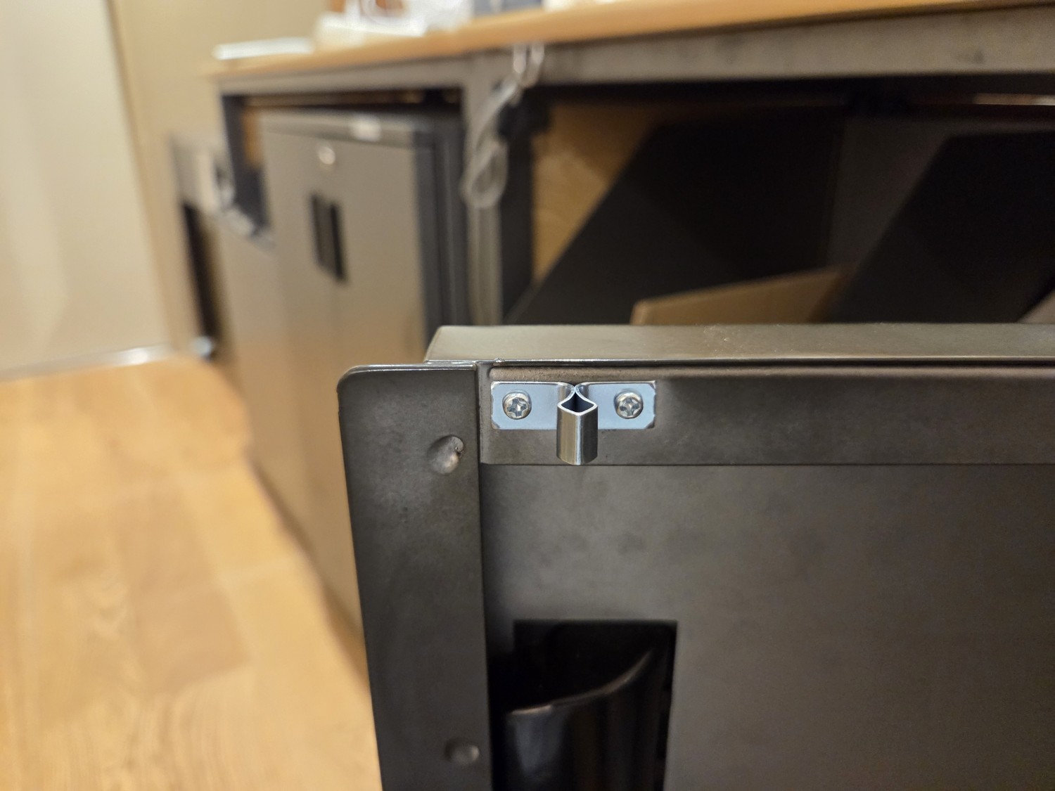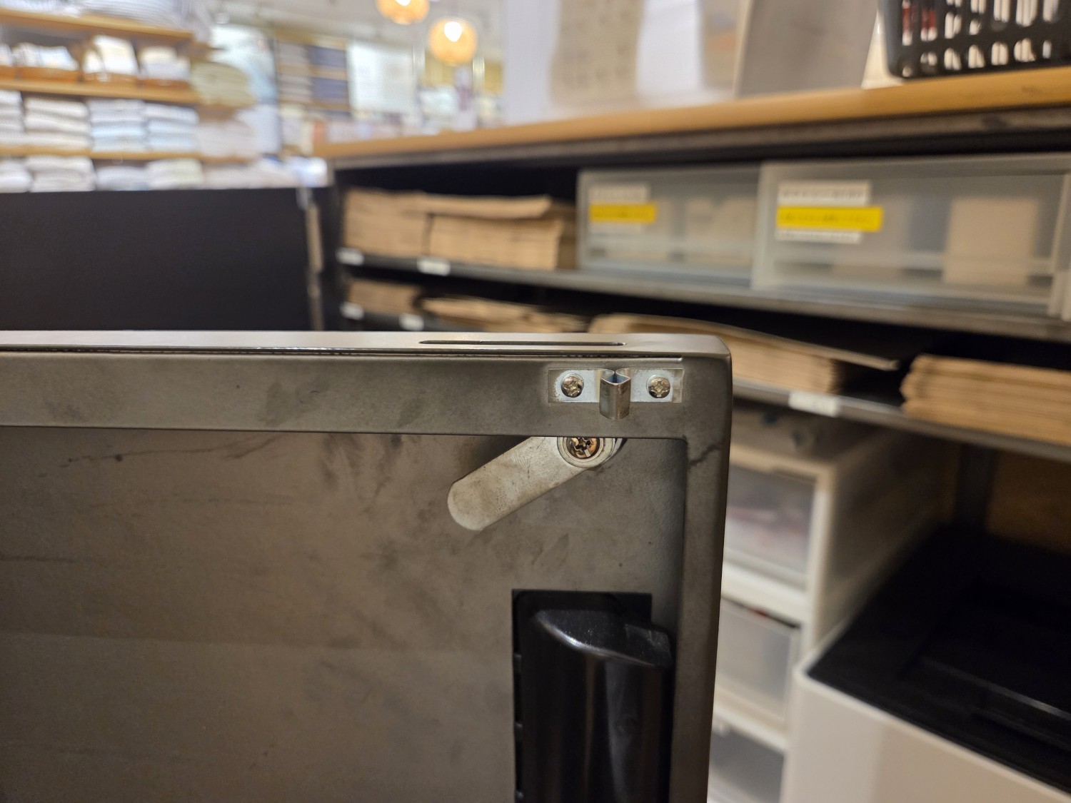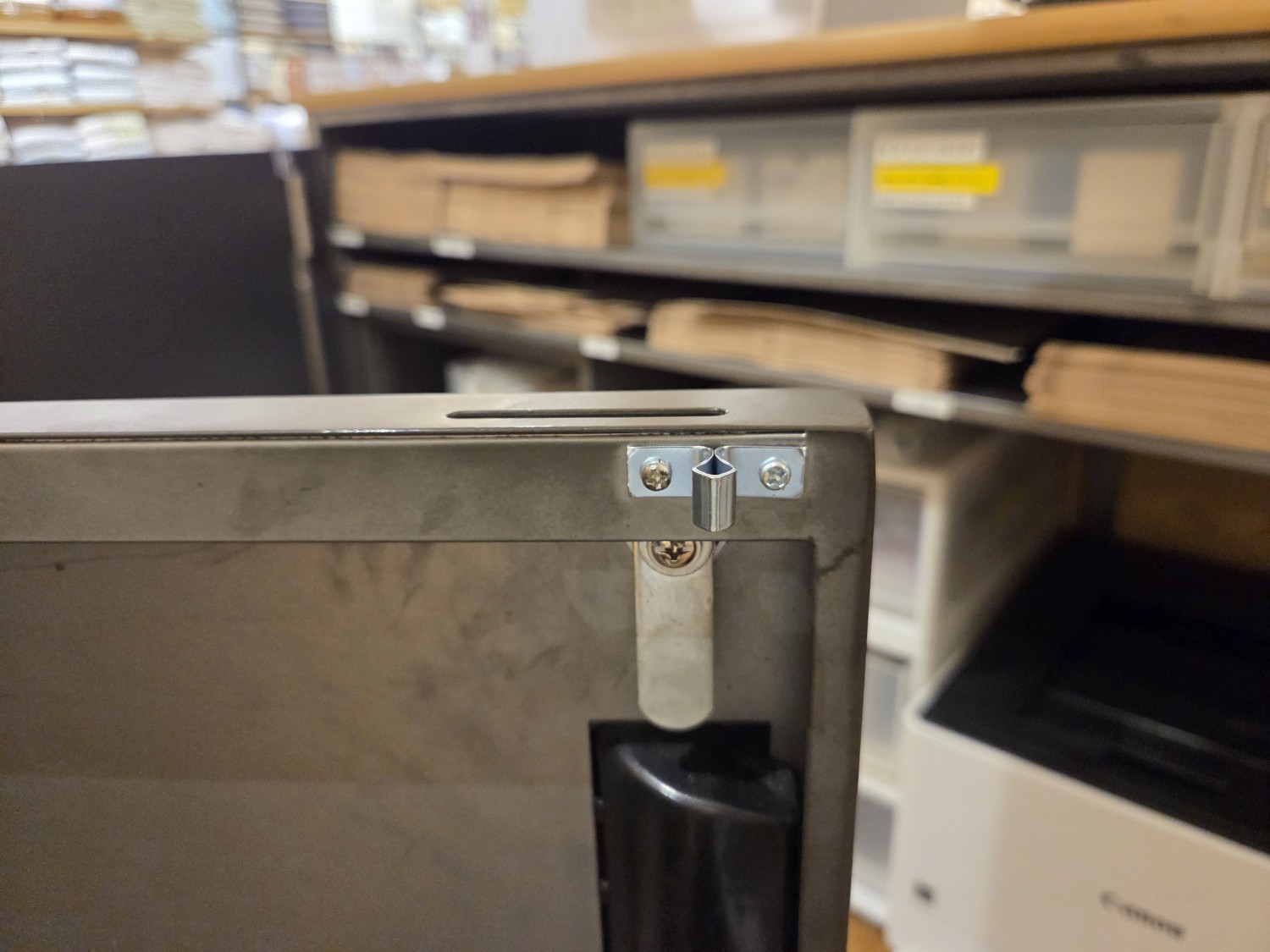 書庫の金具(ローラーキャッチ)が曲がり破損したため、鍵がかけれなくなったので、ローラーキャッチを交換・調整しました。