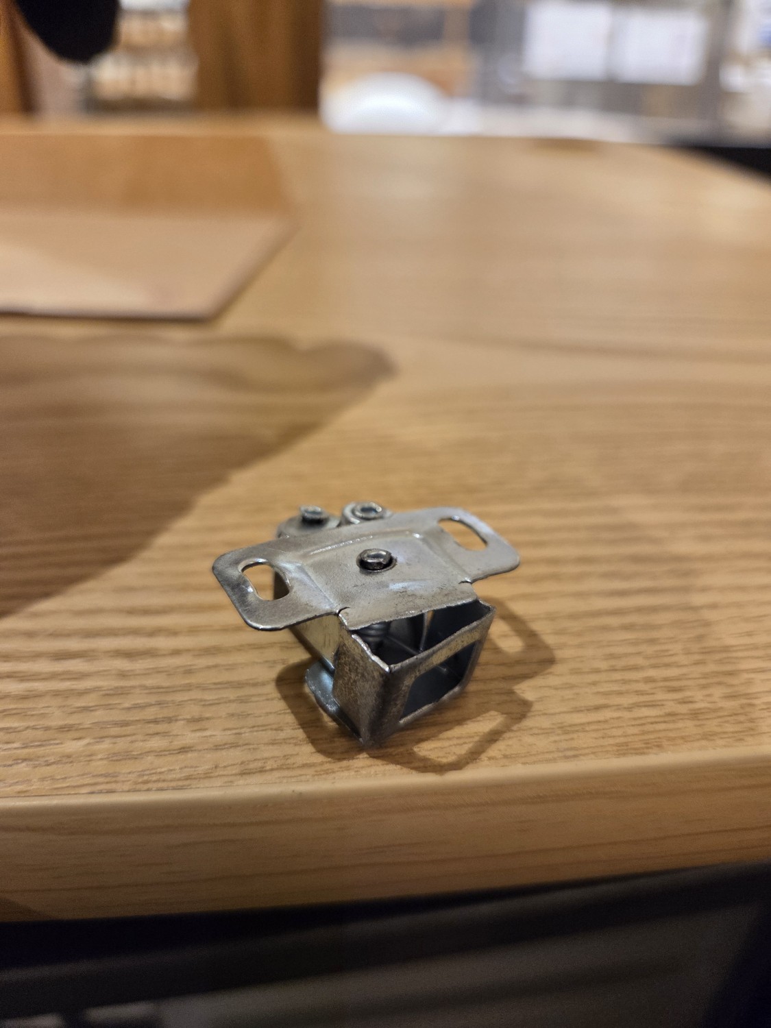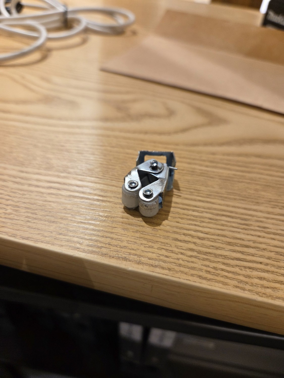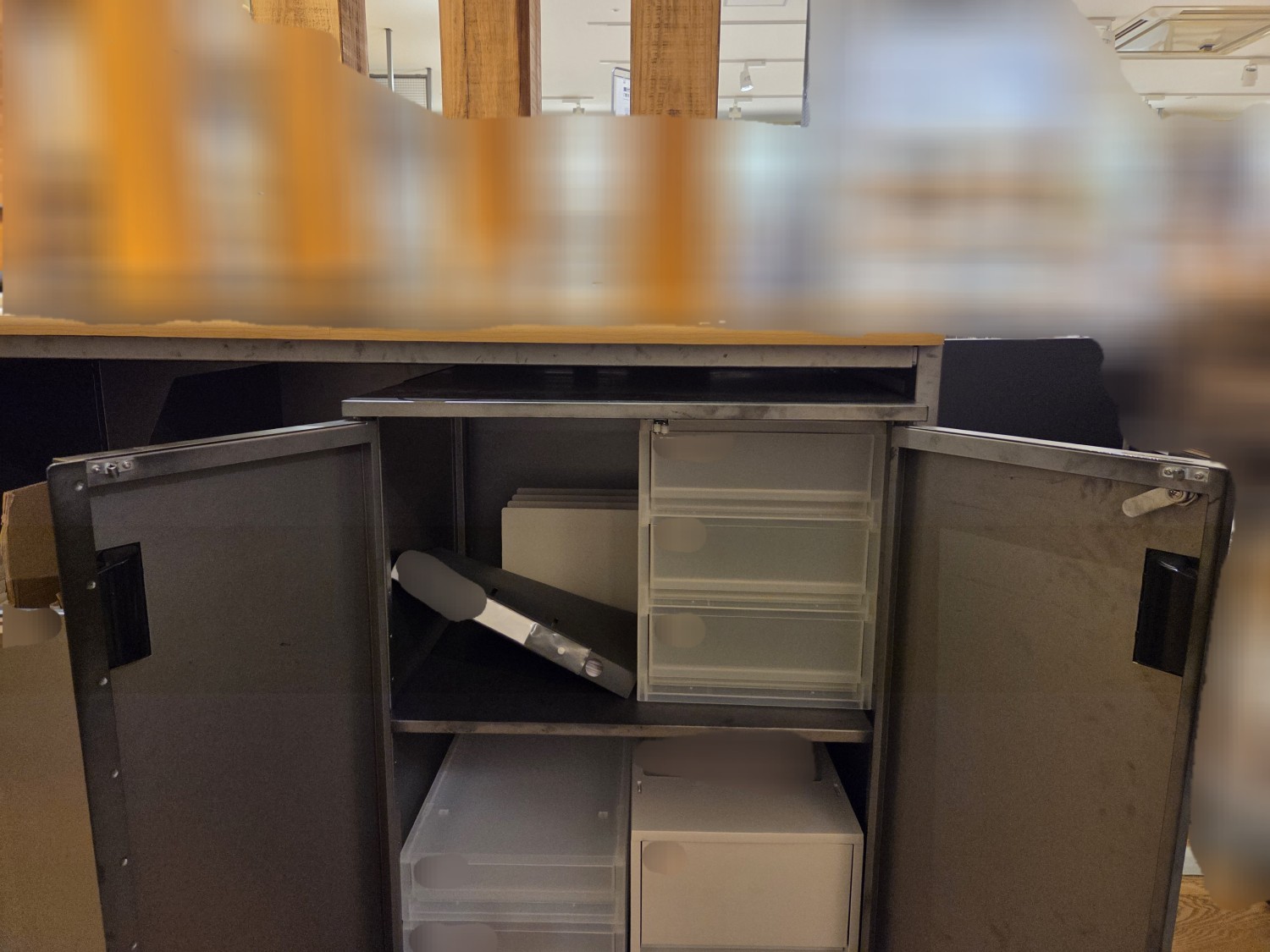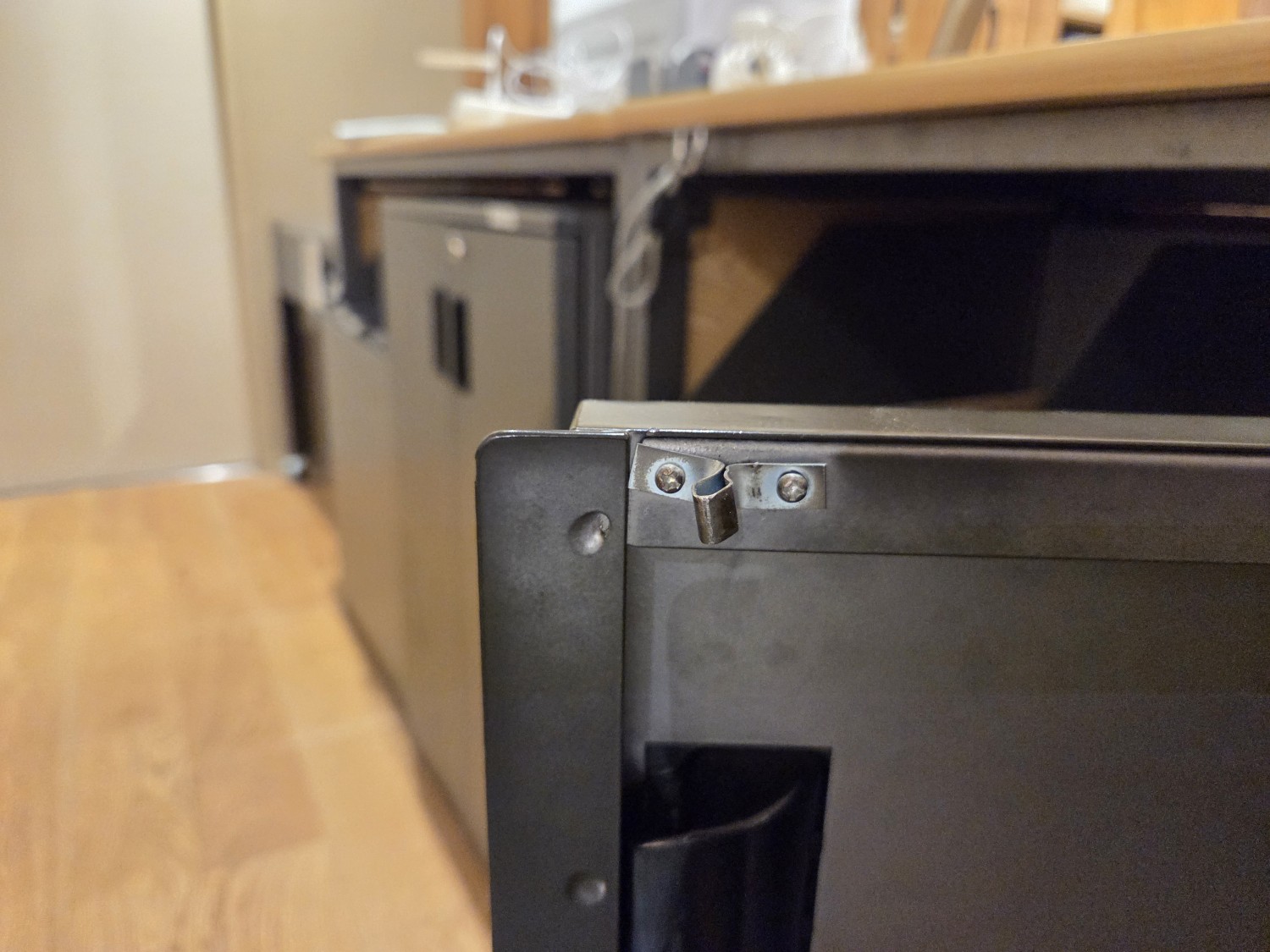 書庫の金具(ローラーキャッチ)が曲がり破損したため、鍵がかけれなくなったので、ローラーキャッチを交換・調整しました。