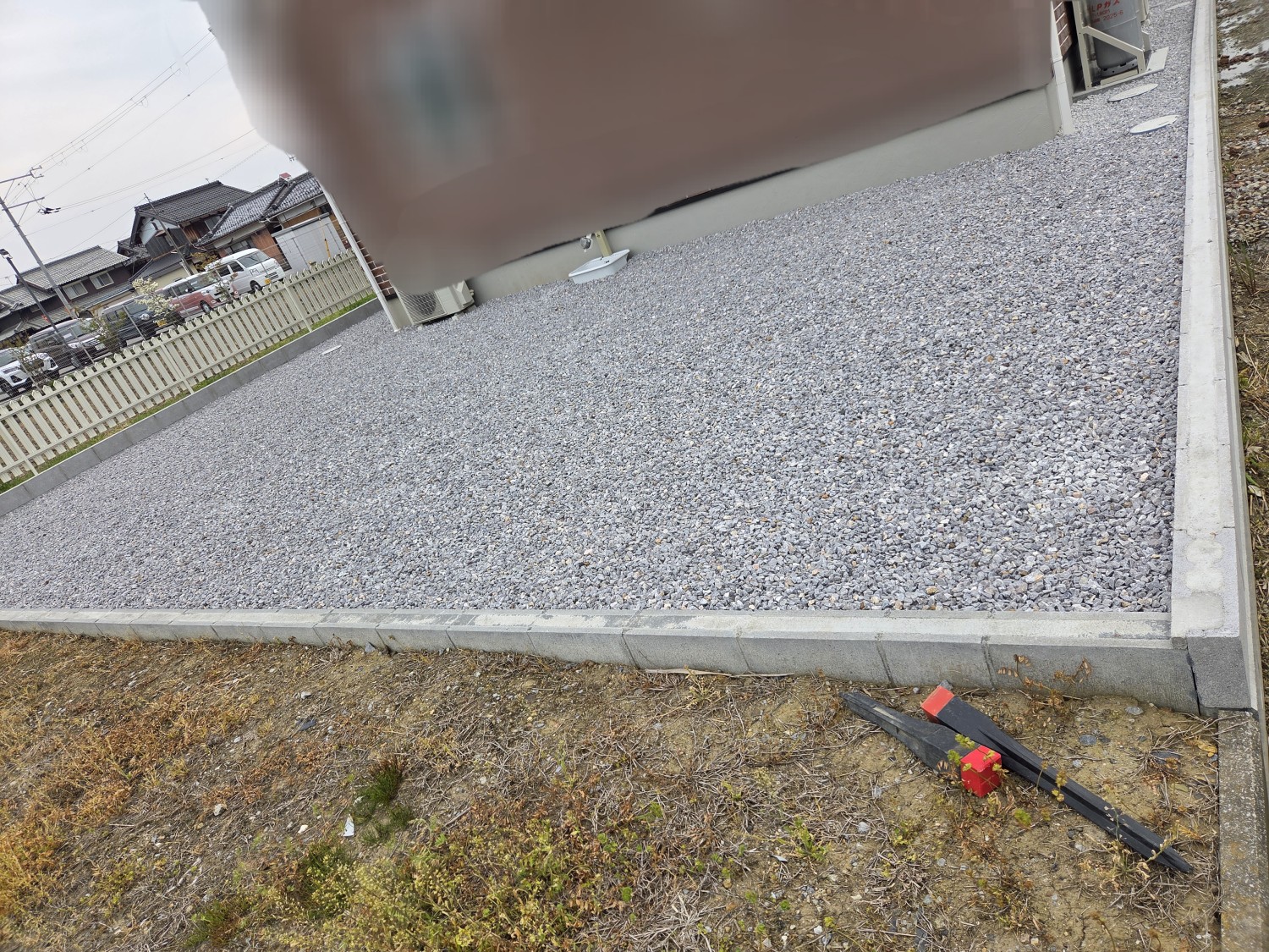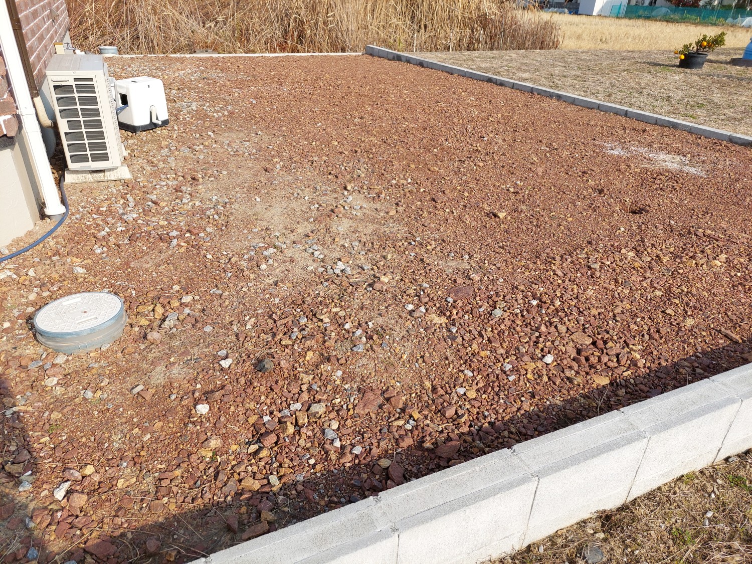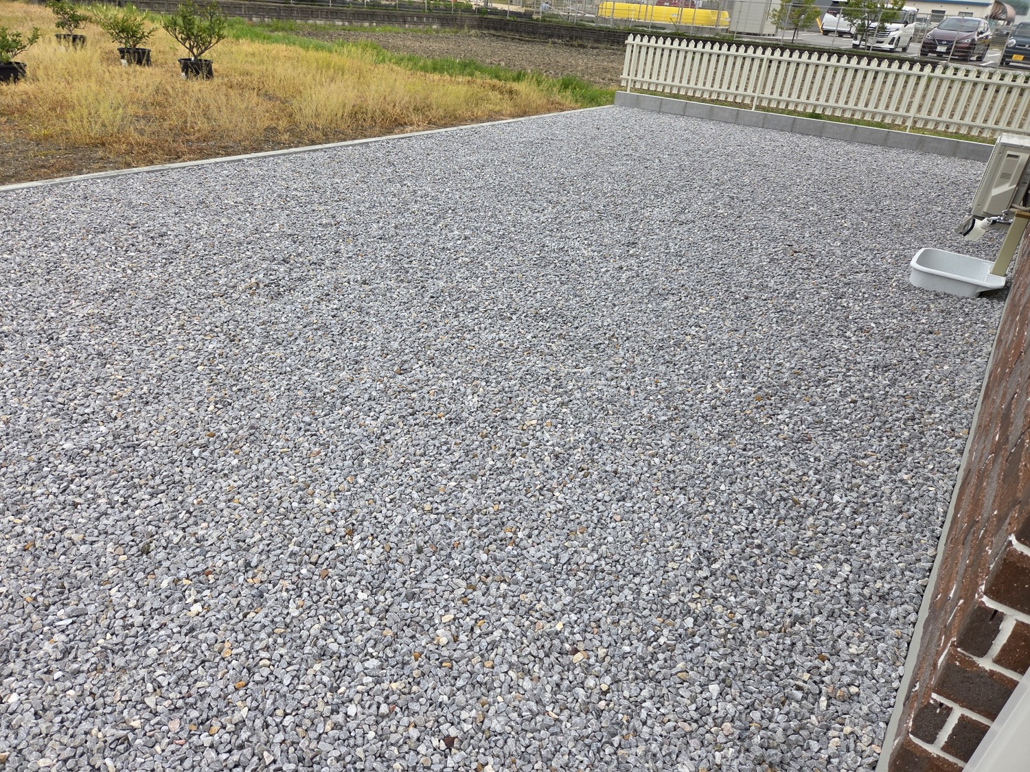 元々の地が相当低いため、まずは砕石を10cm~15cm程入れて転圧処置をおこない、地を上げてからその後に防草シートを敷いて、砂利を入れ砂利敷きをおこないました。