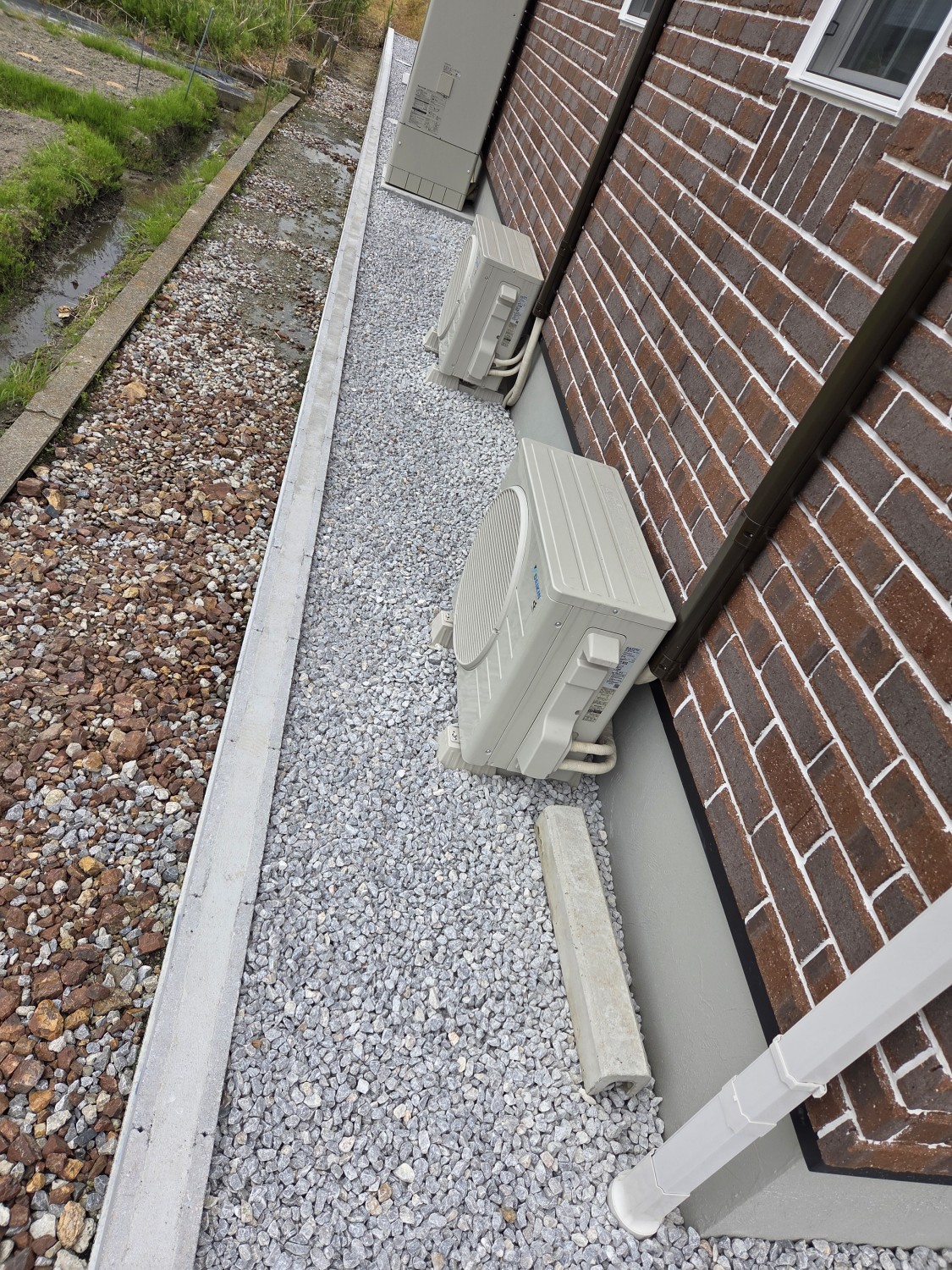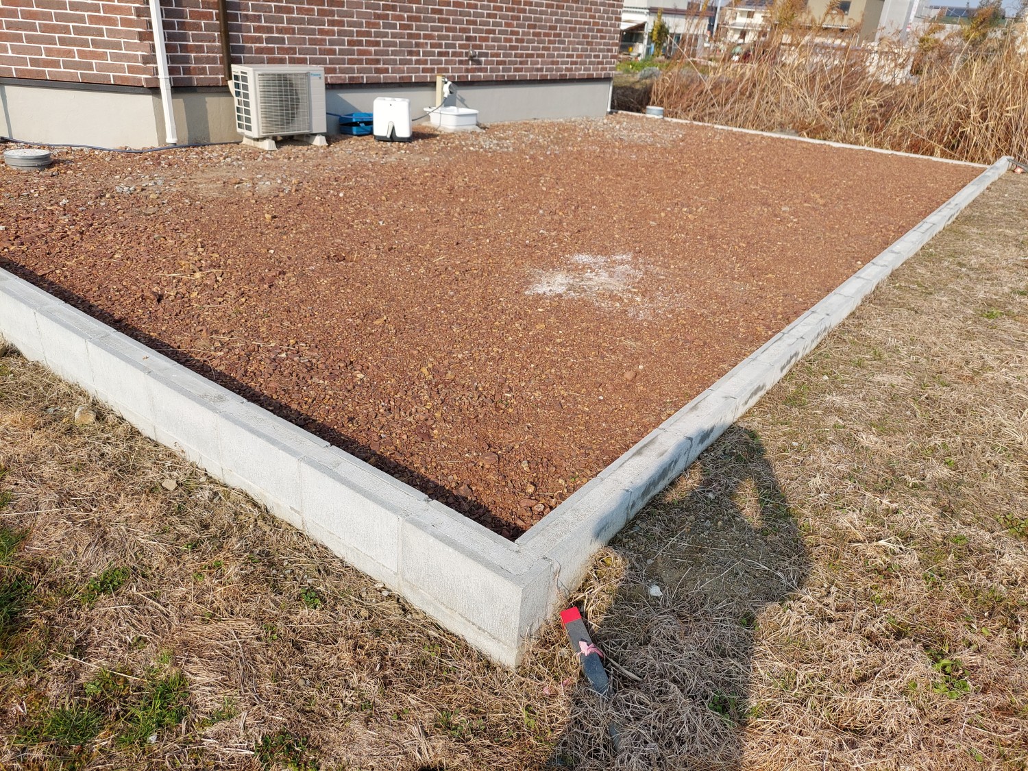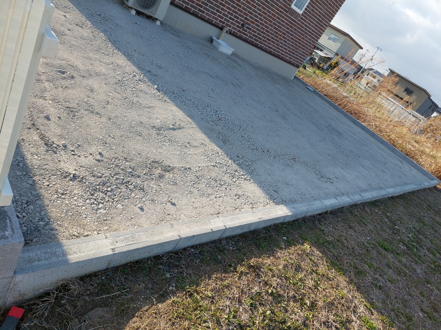元々の地が相当低いため、まずは砕石を10cm~15cm程入れて転圧処置をおこない、地を上げてからその後に防草シートを敷いて、砂利を入れ砂利敷きをおこないました。