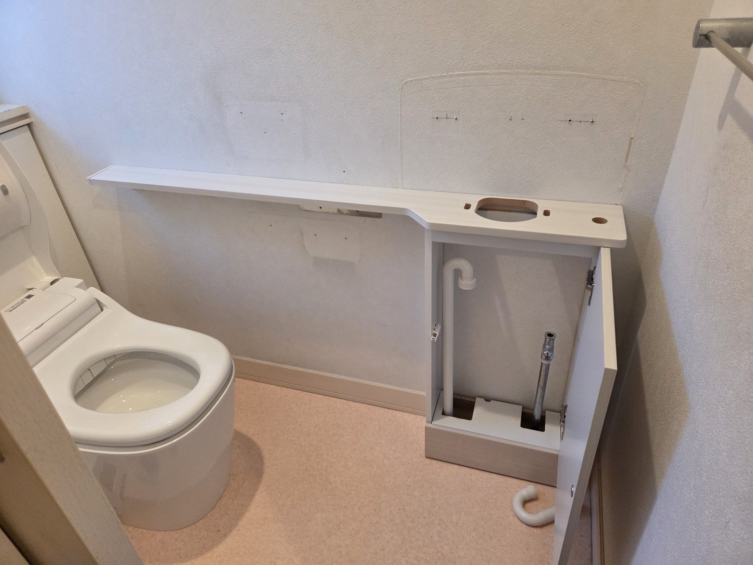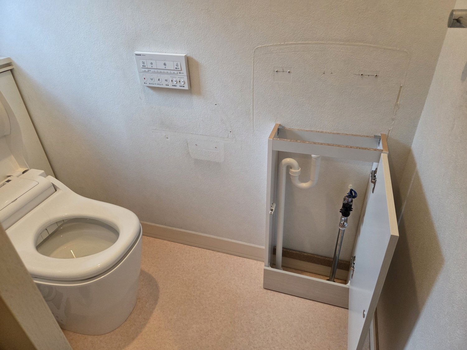今回は、配管隠しのボックスとカウンター台及びパネル張り、そして水栓を自動式へ変更しました。