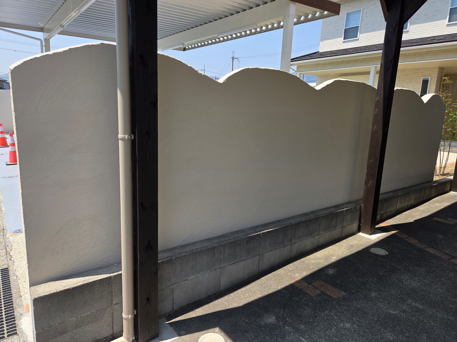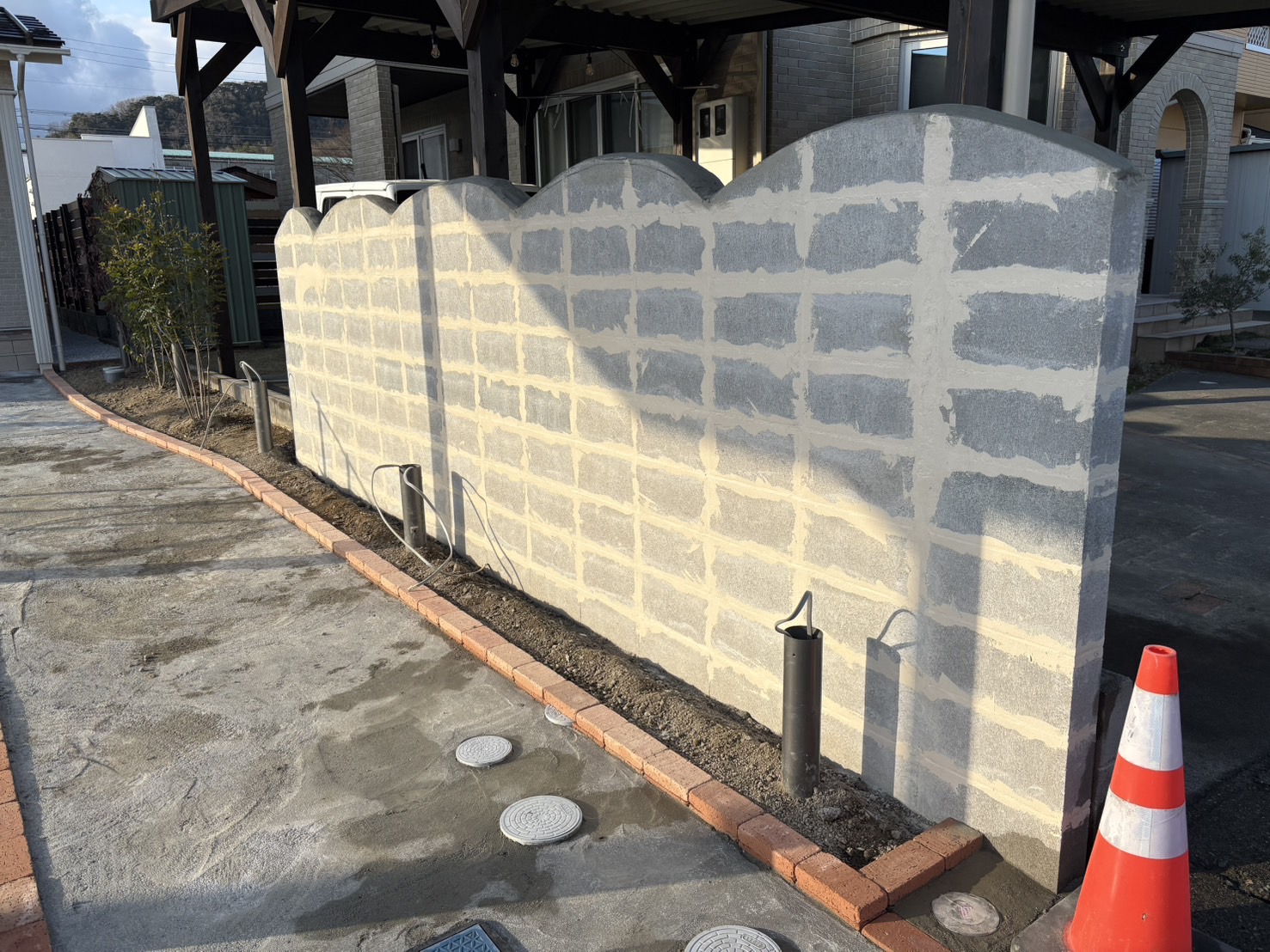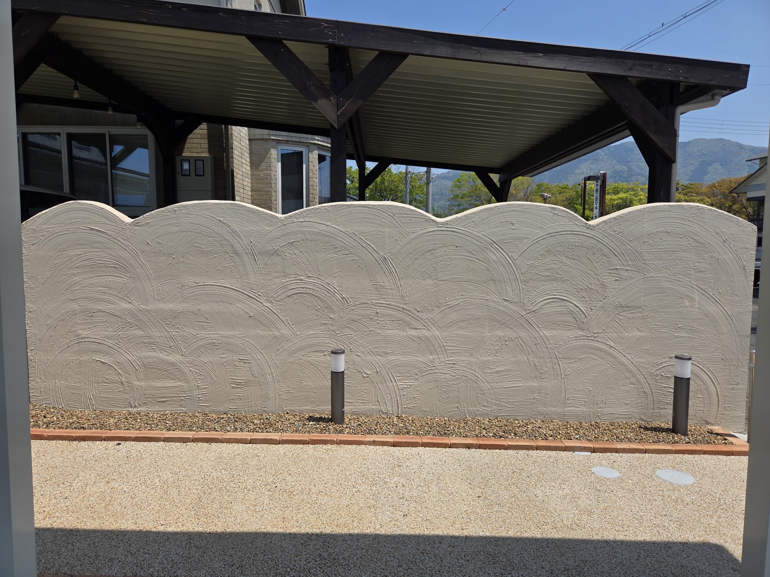 ブロックを積んで、ブロック塀の頭を丸くカットを施し、全体的に波をイメージして造作しました。