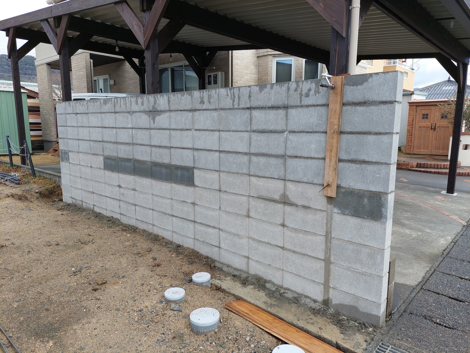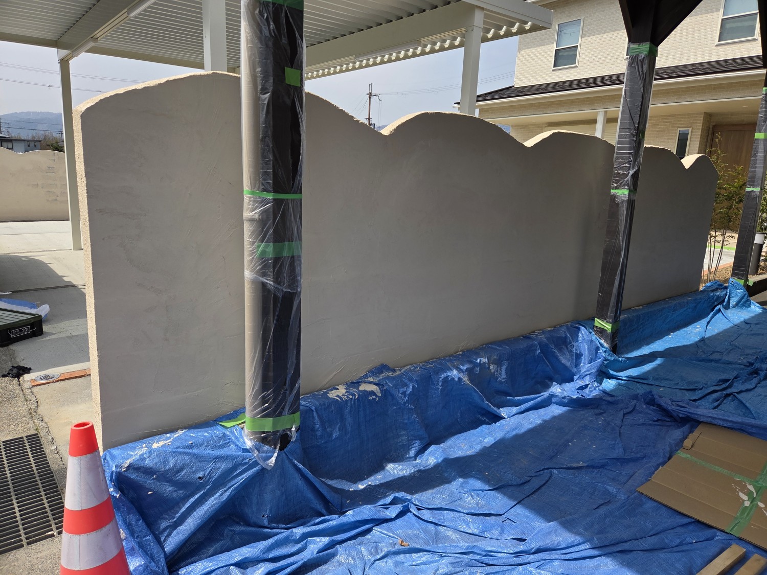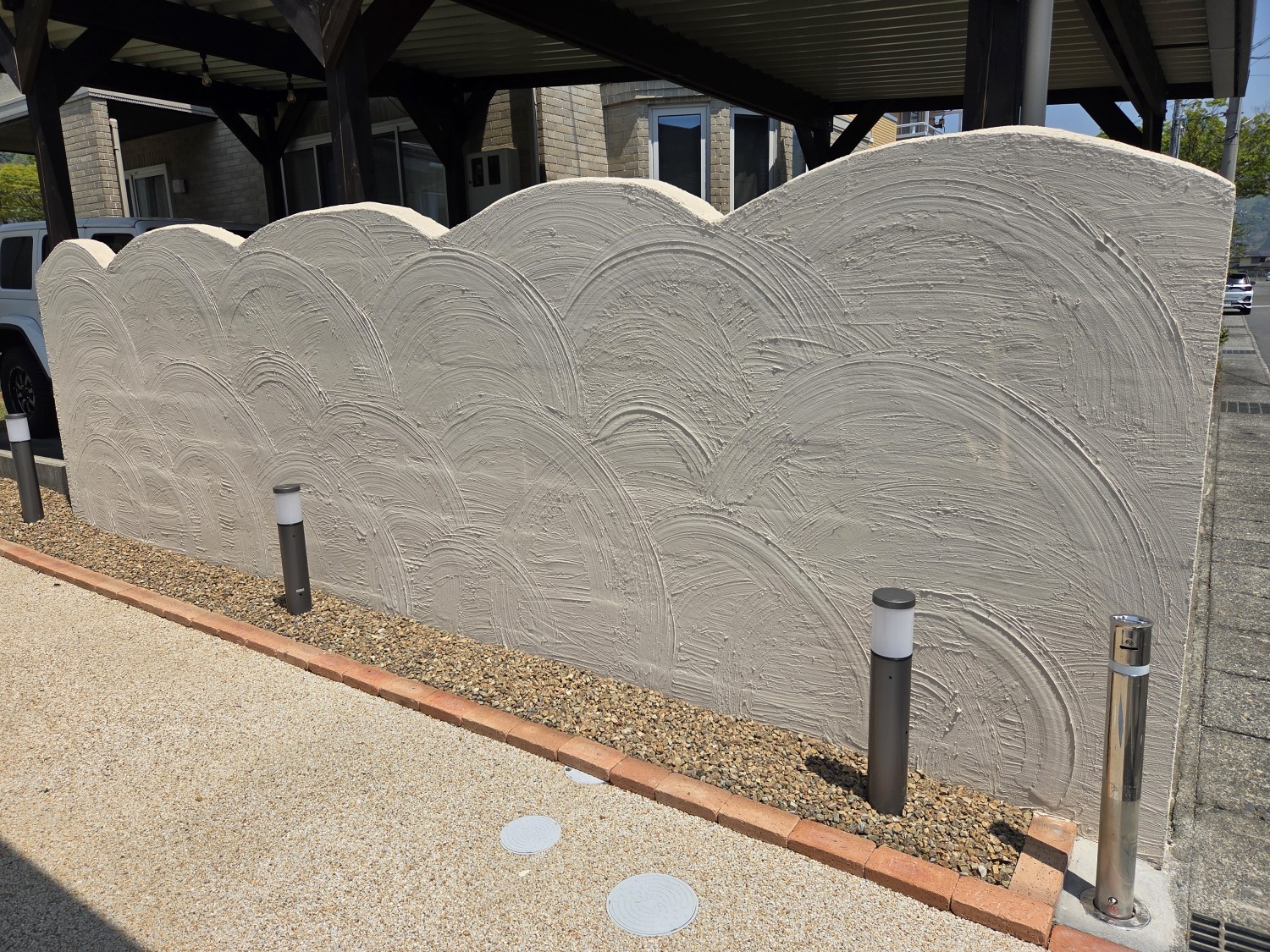 ブロックを積んで、ブロック塀の頭を丸くカットを施し、全体的に波をイメージして造作しました。