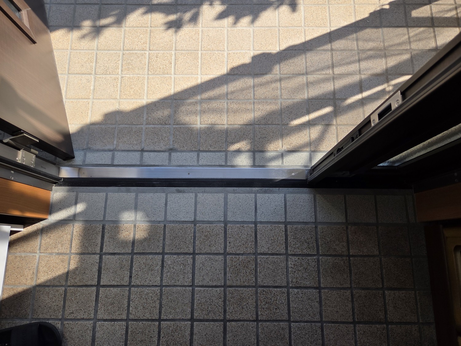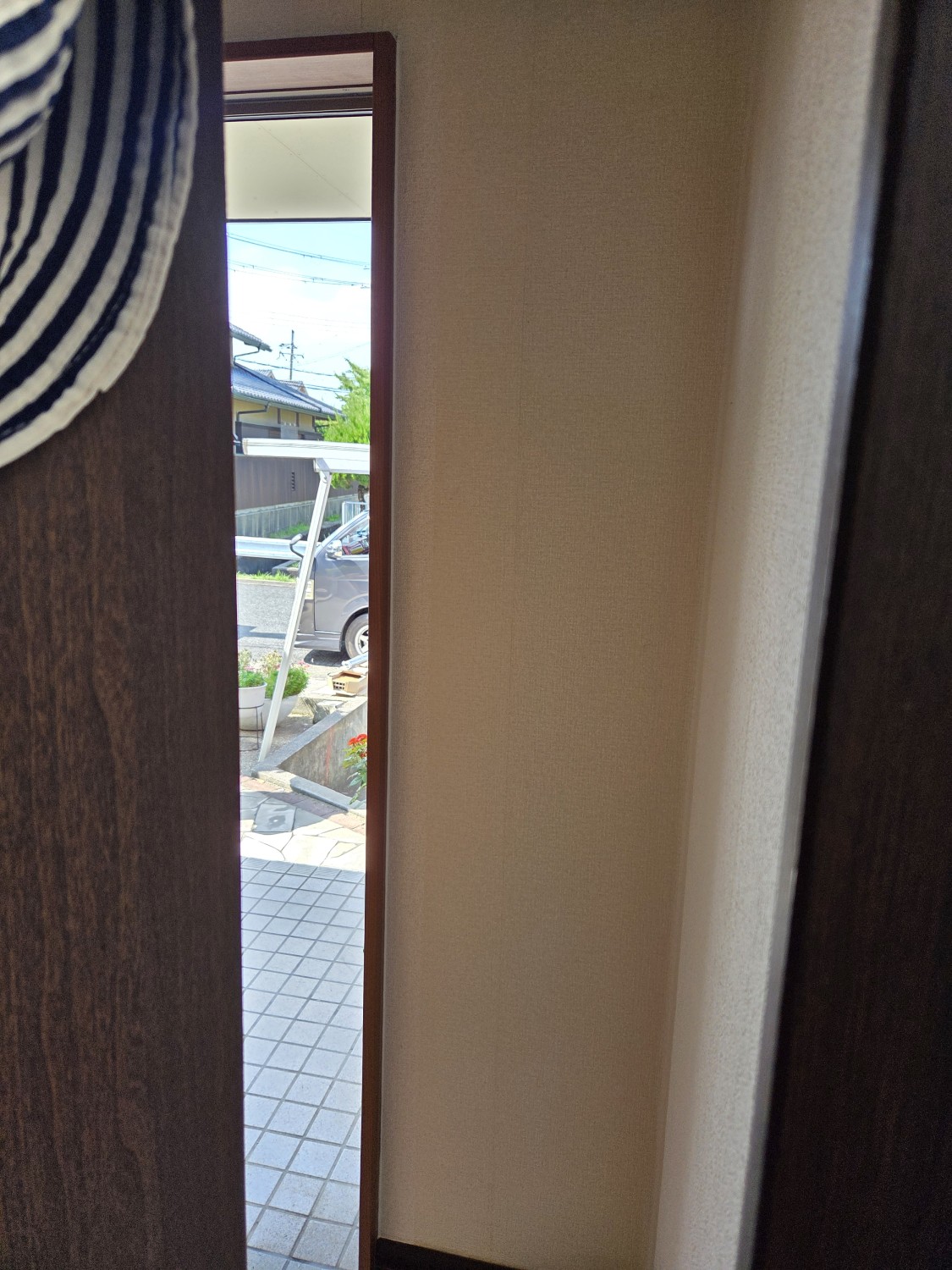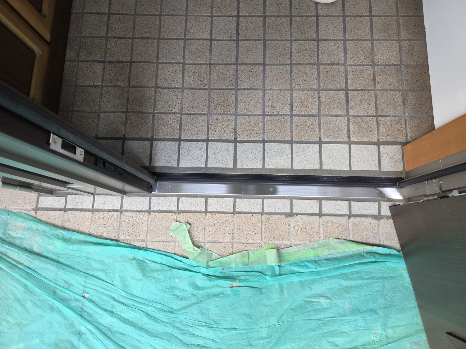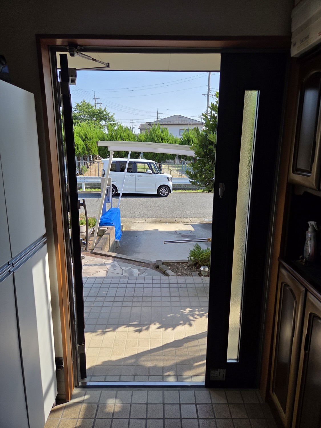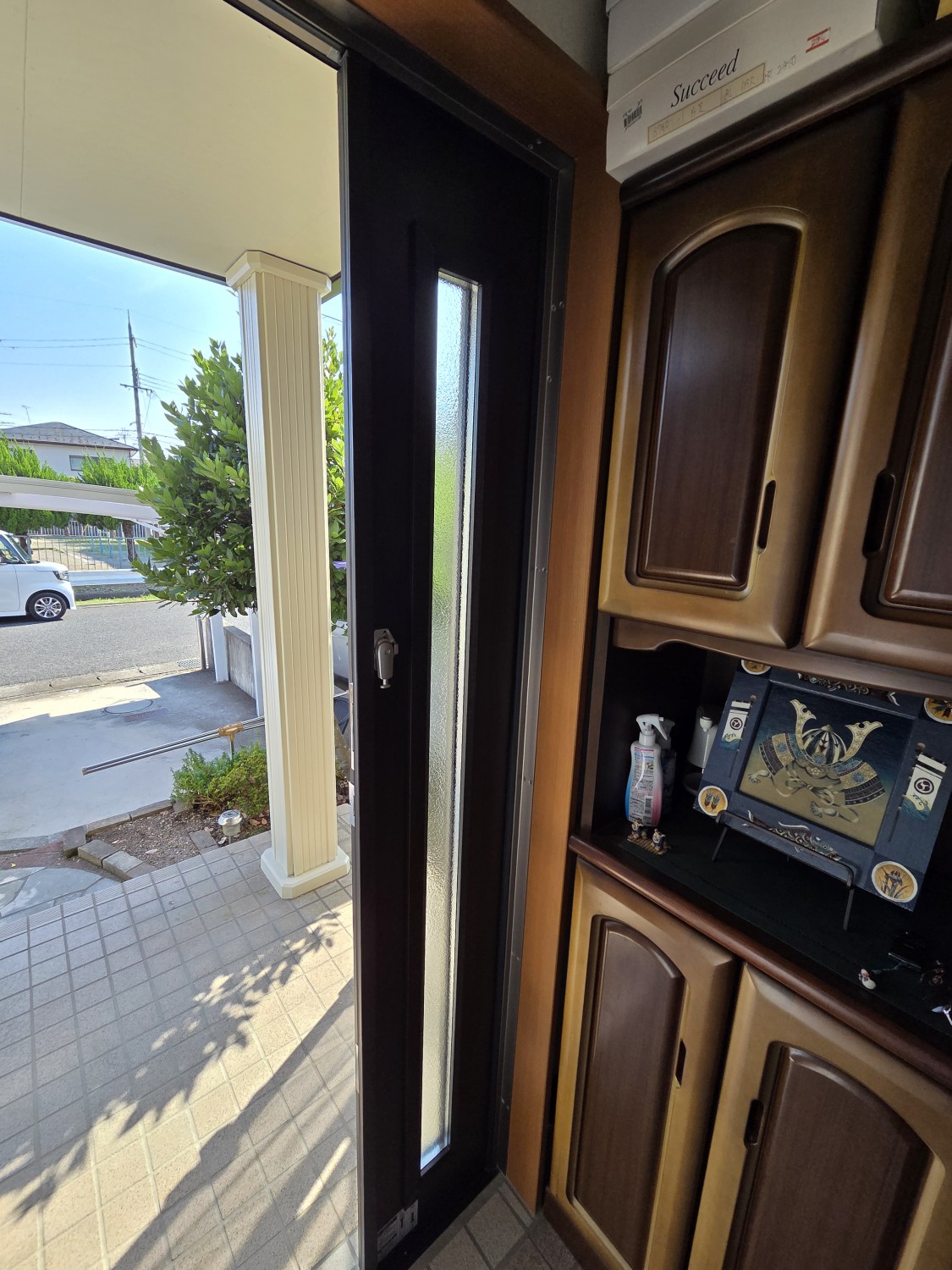 玄関親子ドアの交換に際し、下部のタイルの張り替えと、ドア周りの枠木の新規設置並びに枠木周りのクロス(壁紙)貼りもおこない、復旧してあります。