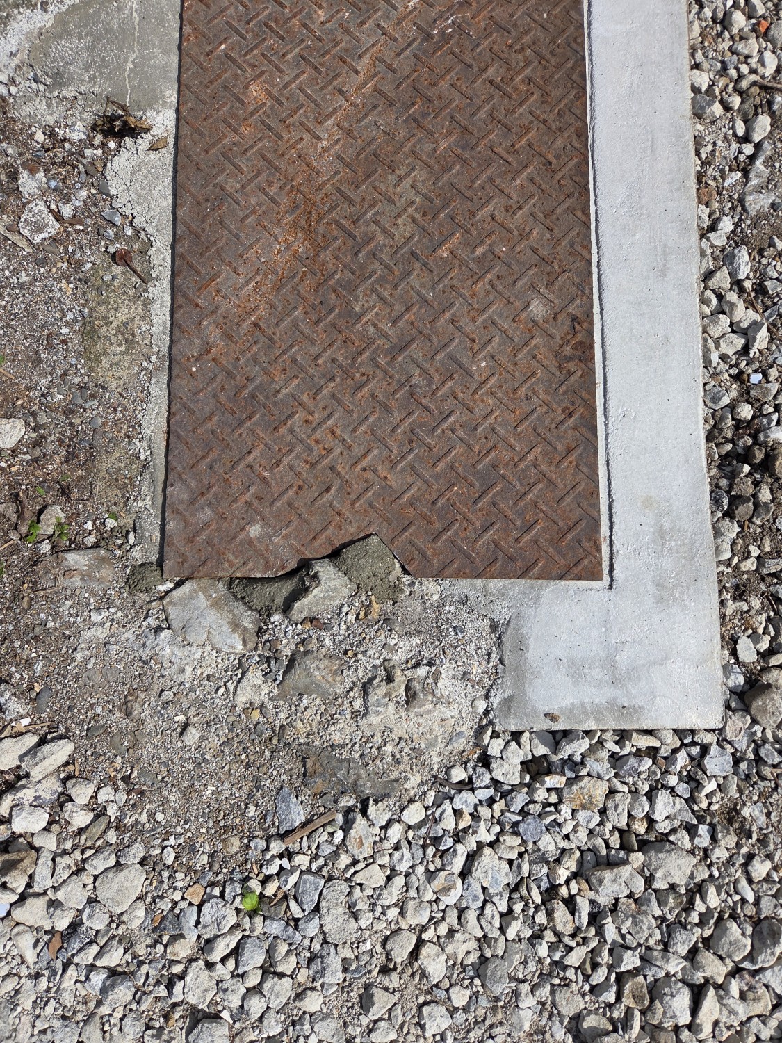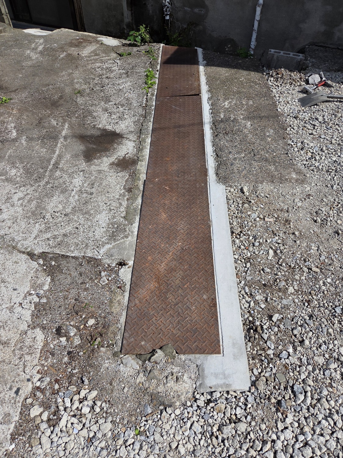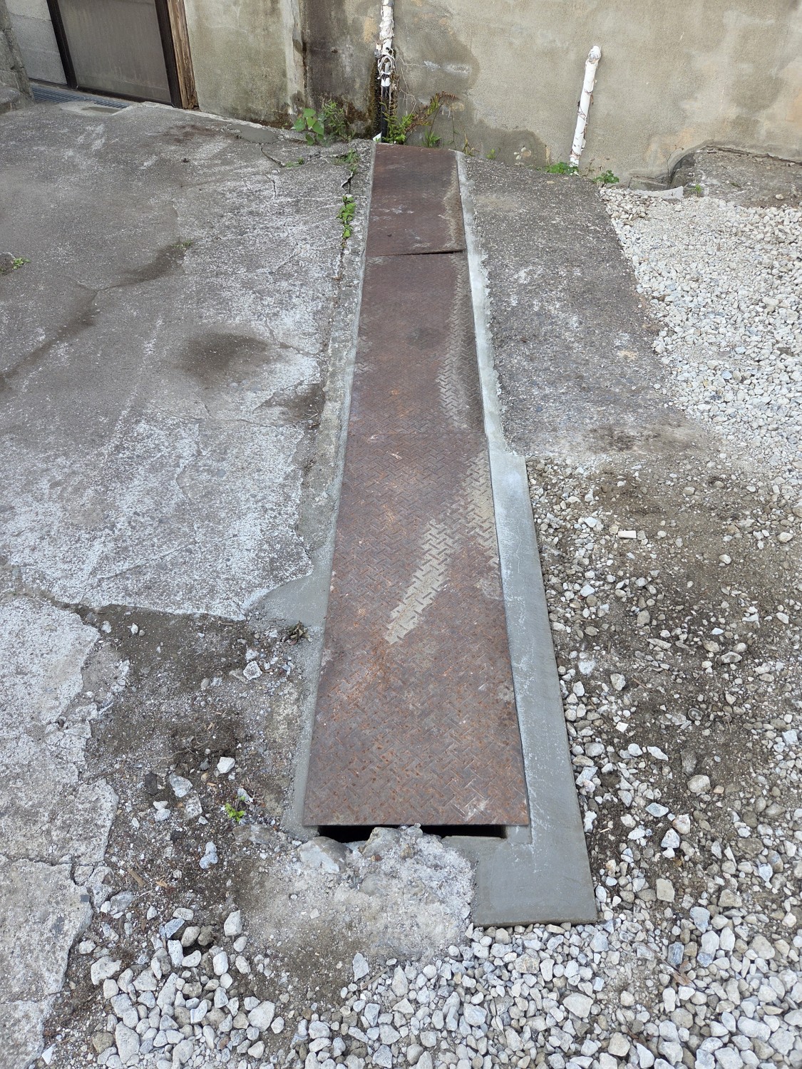 縞鋼板の端を加工して、既存箇所の形状に合わせ、砂利等の落下が起きないようにしました。