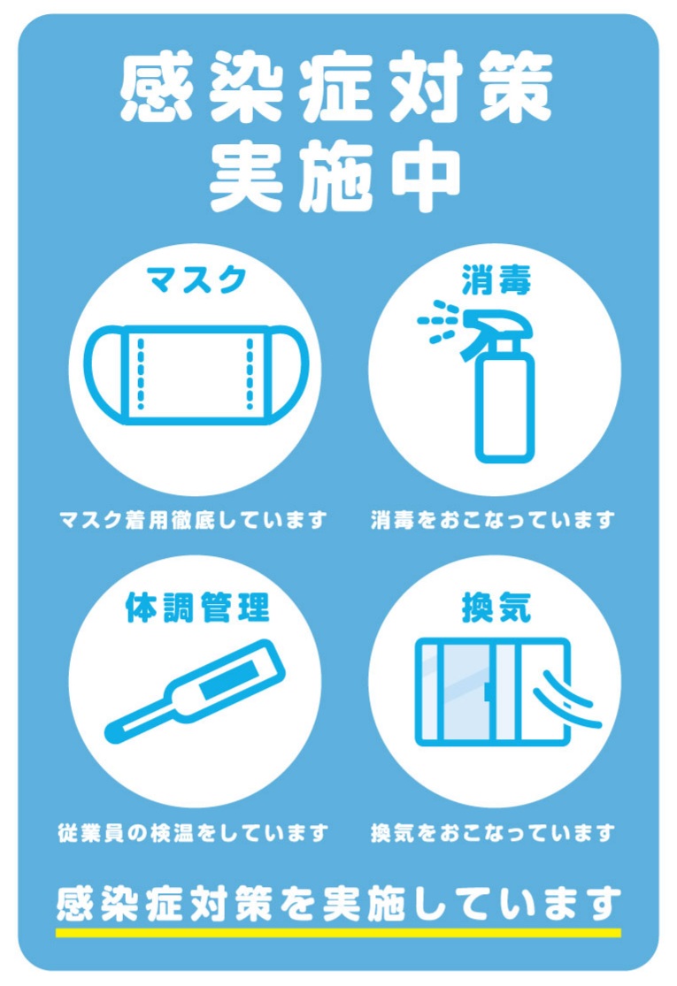 コロナウイルス対策としまして、日々の検温はもちろん、訪問時は消毒及びマスク着用を徹底しております。